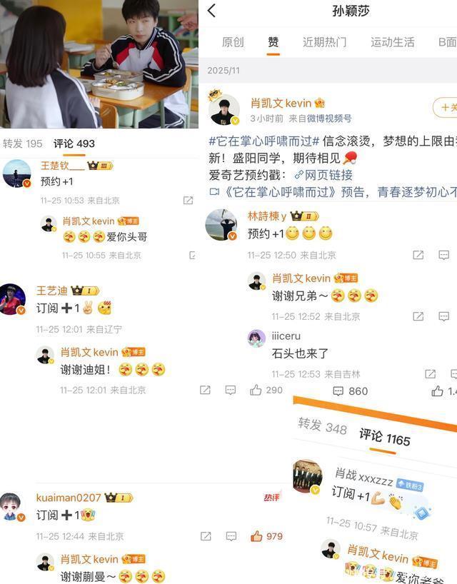 今天肖凯文发微博后,王楚钦就来预约了,后面看到王艺迪、林诗栋、蒯曼、肖导都来订阅新剧了,大家真的都很给面子的。莎莎虽然没有留言,但是也给肖凯文点赞了,这是肖凯文的第一部剧,就得到这么多人的支持,也很幸福了。看来肖导也很支持儿子的事业,希望肖凯文越来越好。